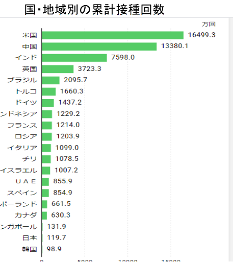 世界全体の接種回数では米国や中国が大きくリード、