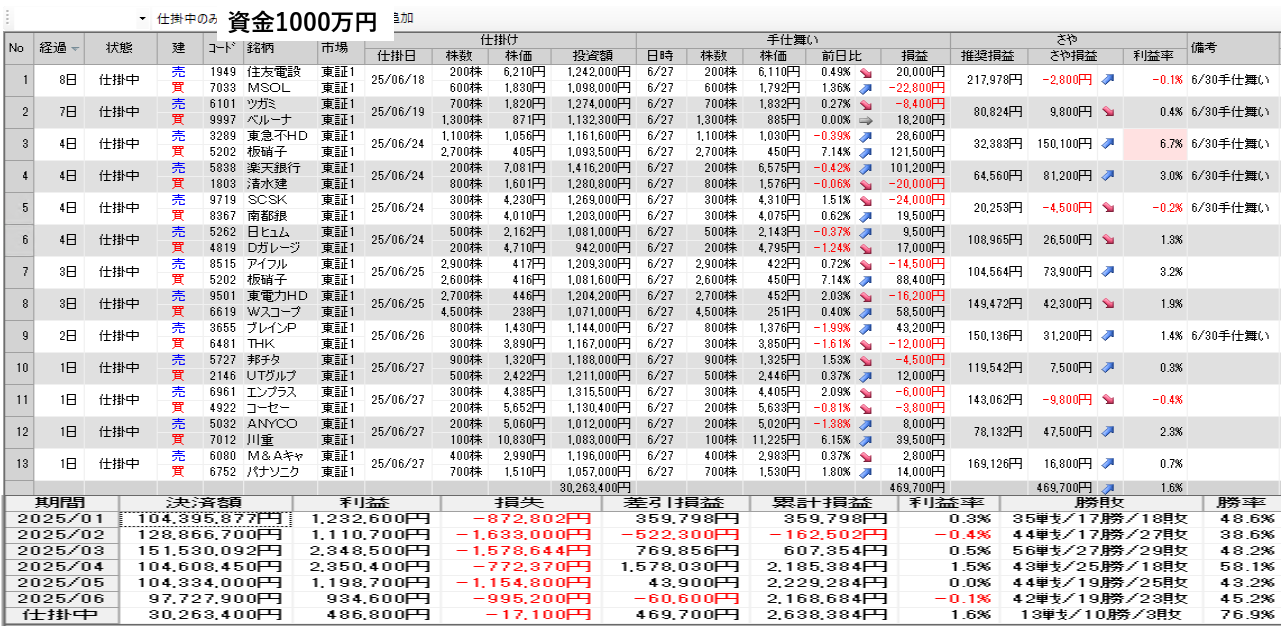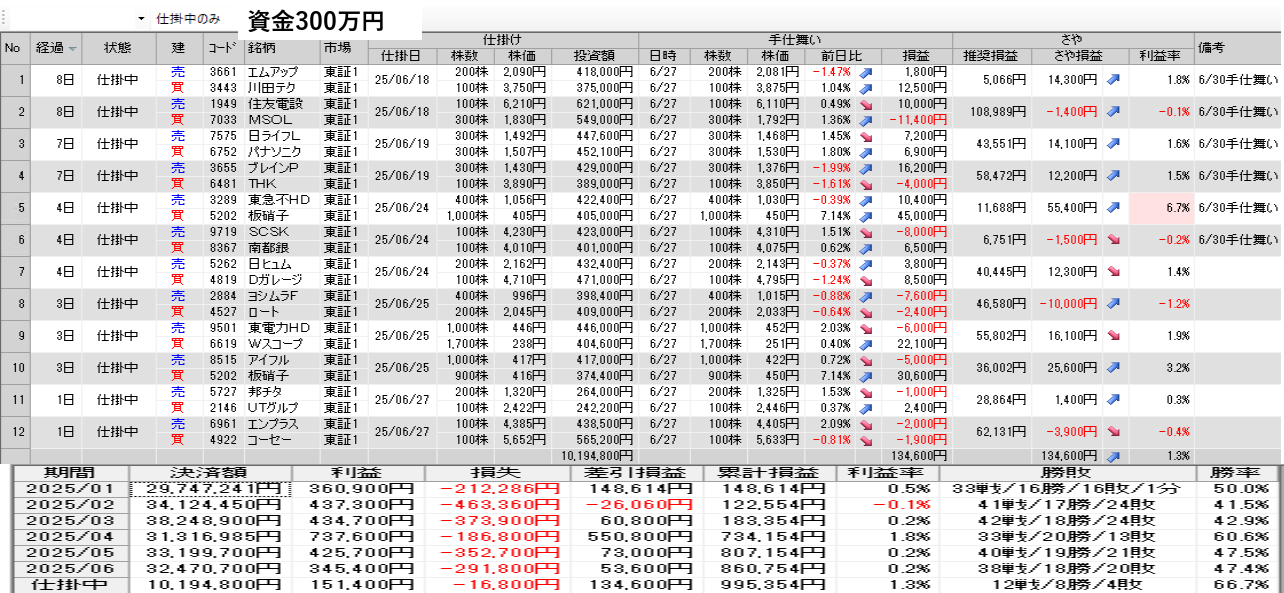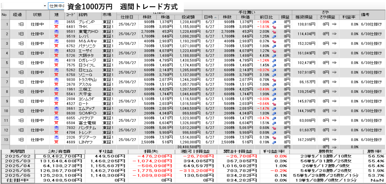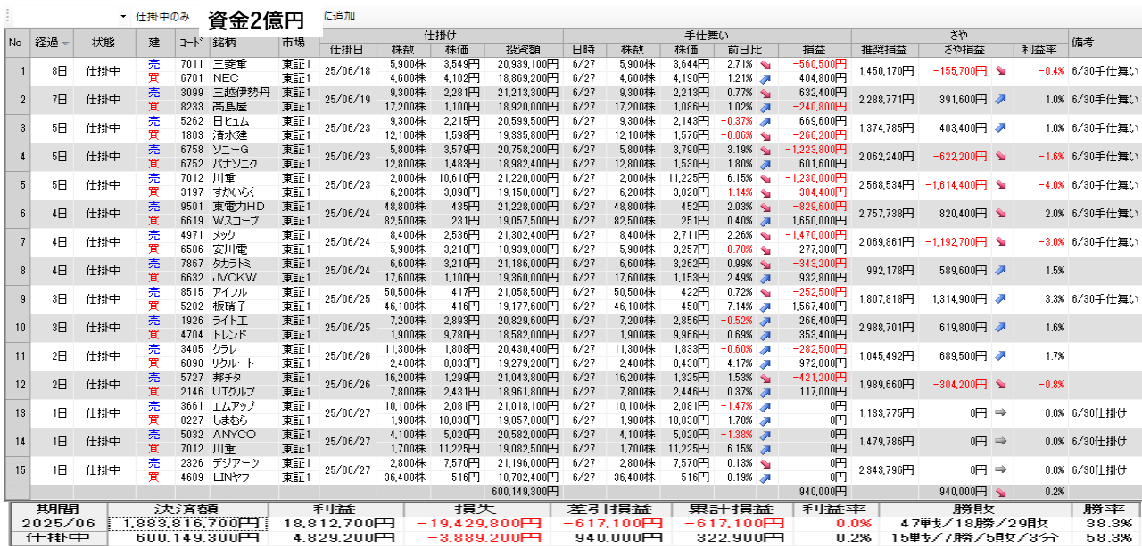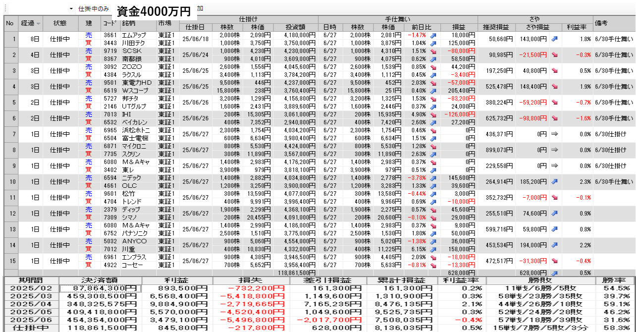 仕掛け及び手仕舞いは、全て翌日の寄付き成行で