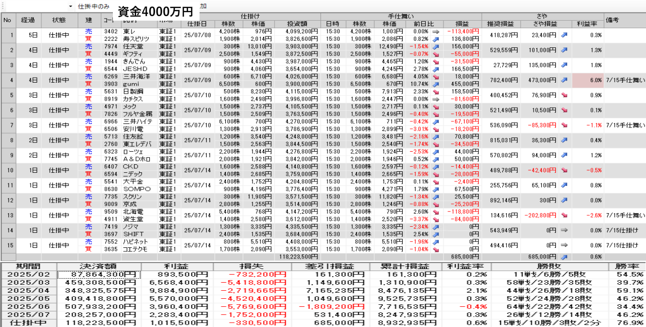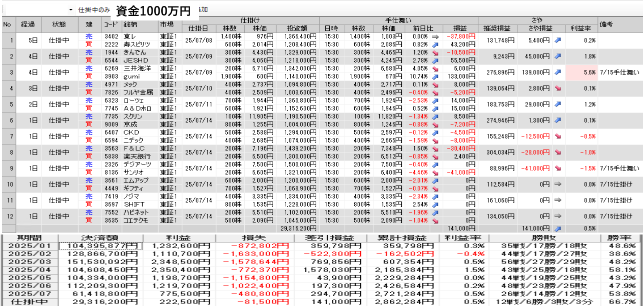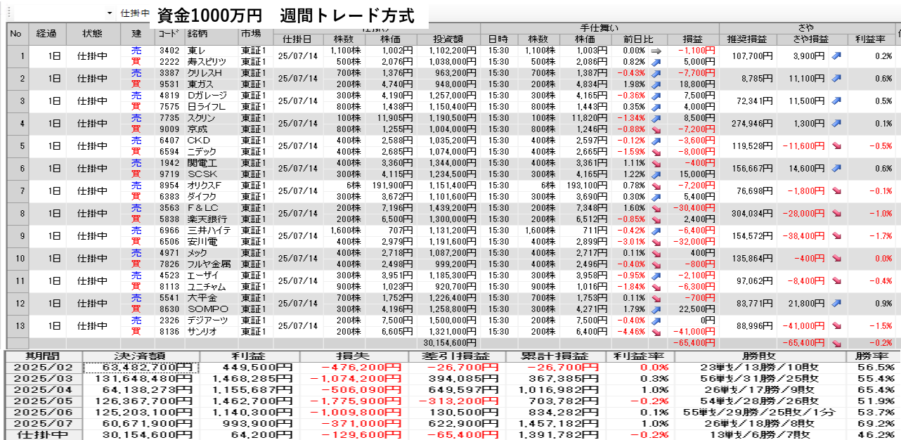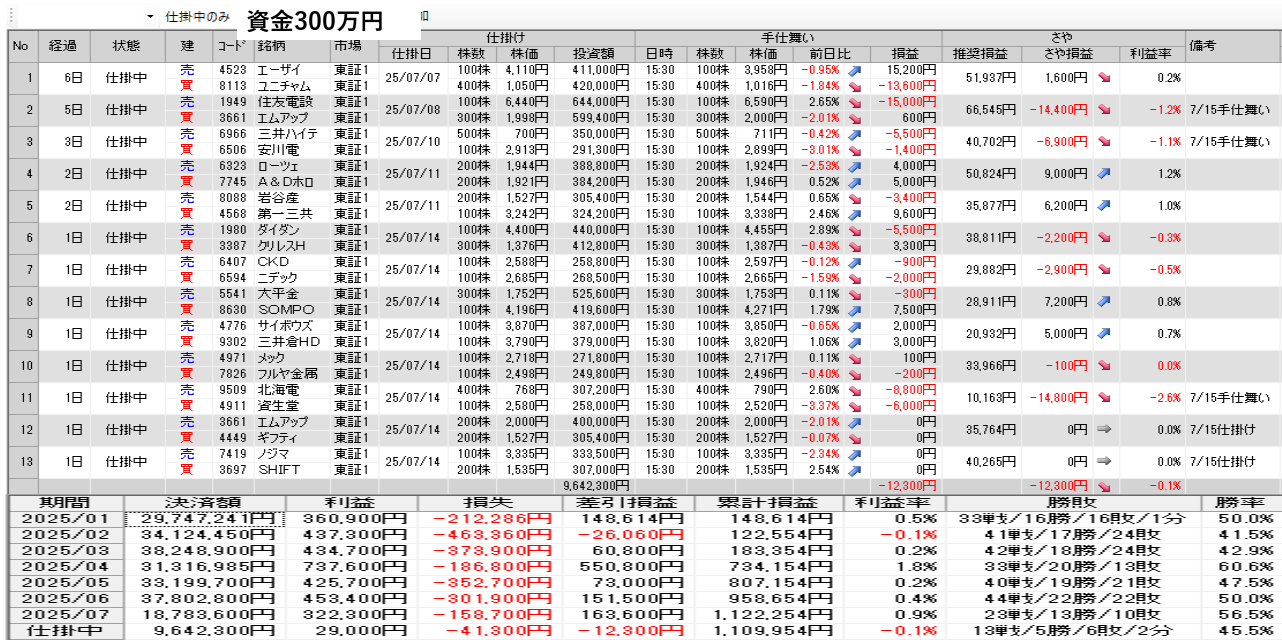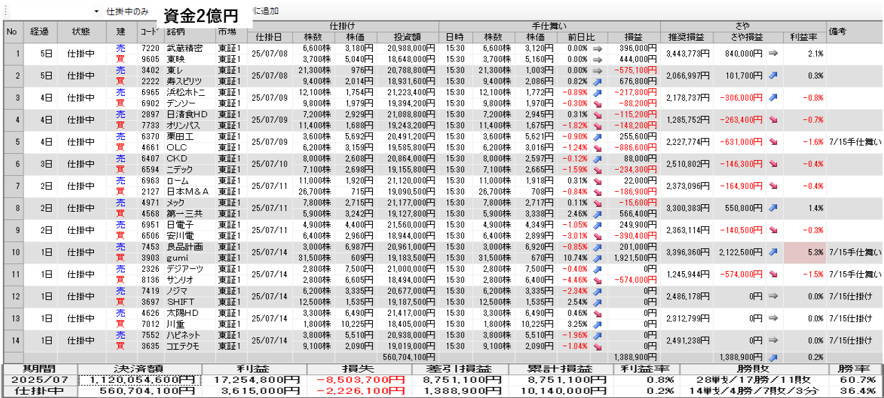 仕掛け及び手仕舞いは、全て翌日の寄付き成行で