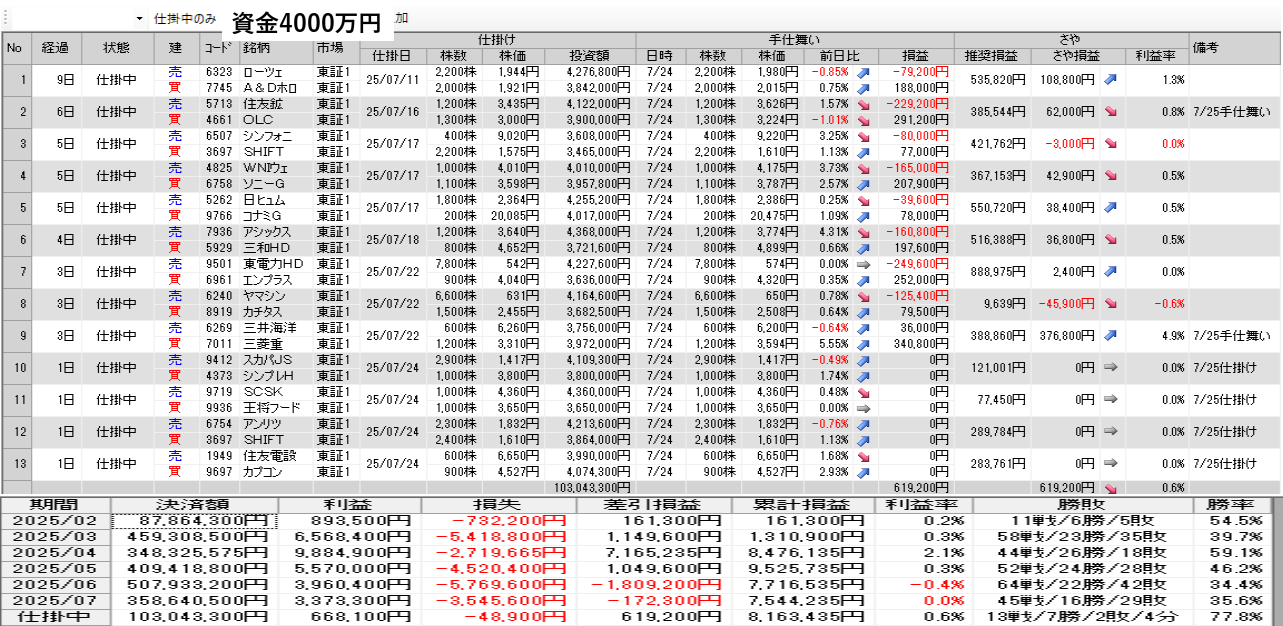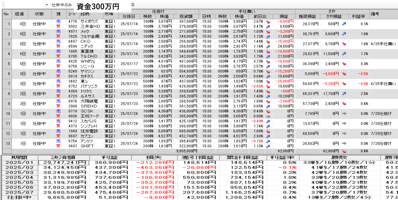 仕掛け及び手仕舞いは、全て翌日の寄付き成行で