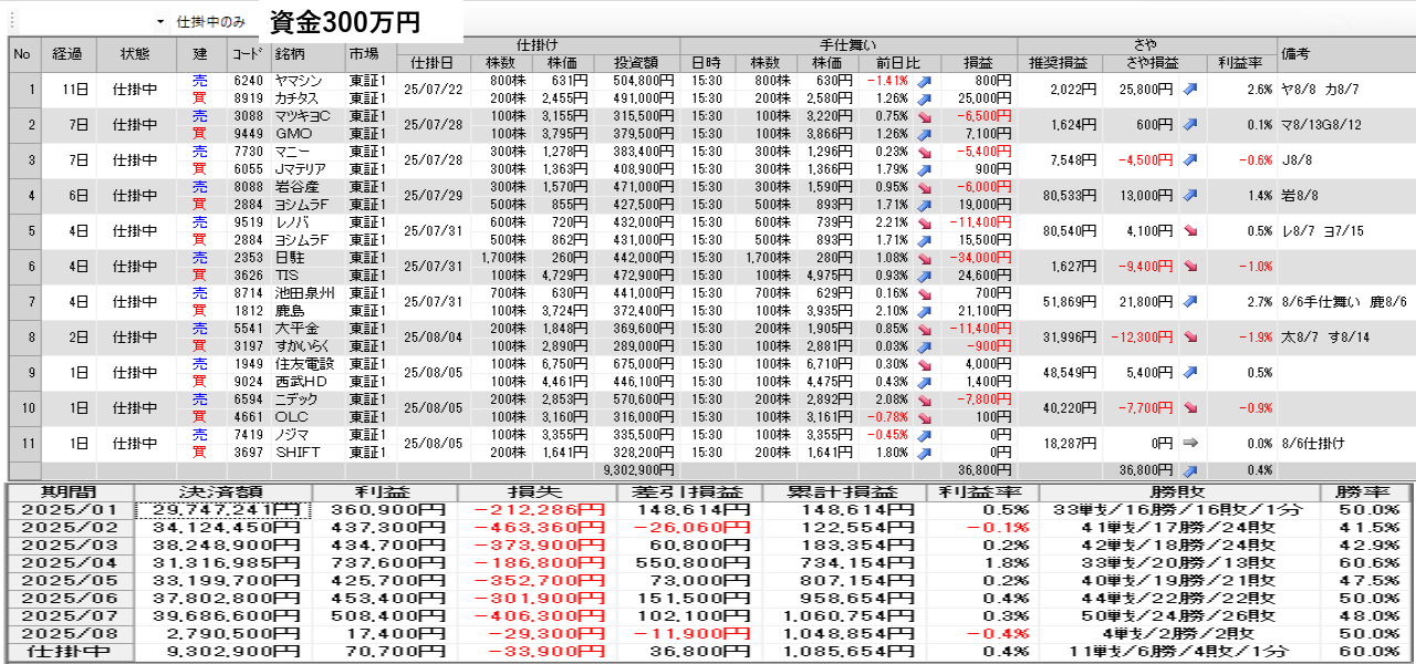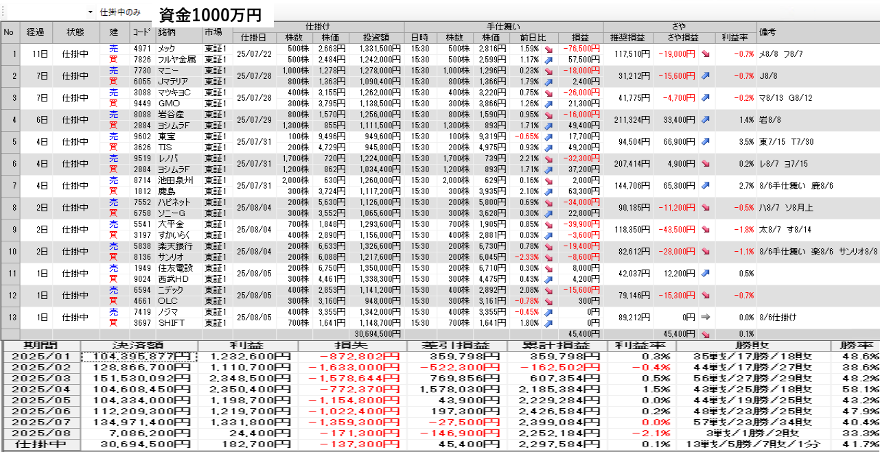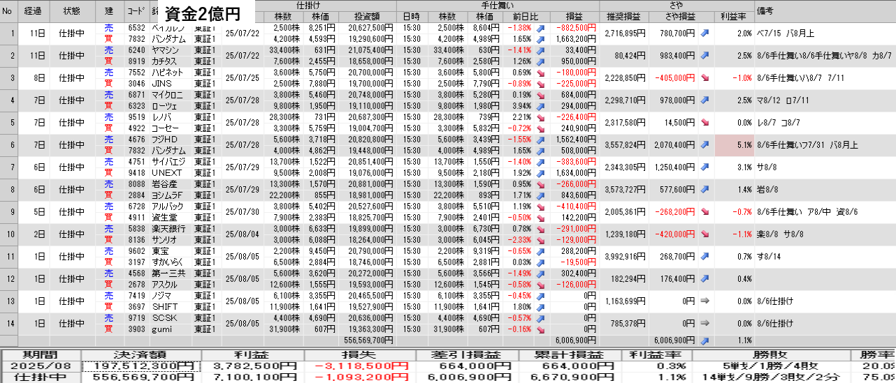 仕掛け及び手仕舞いは、全て翌日の寄付き成行で