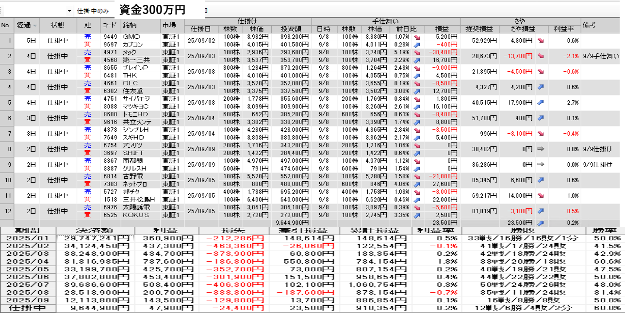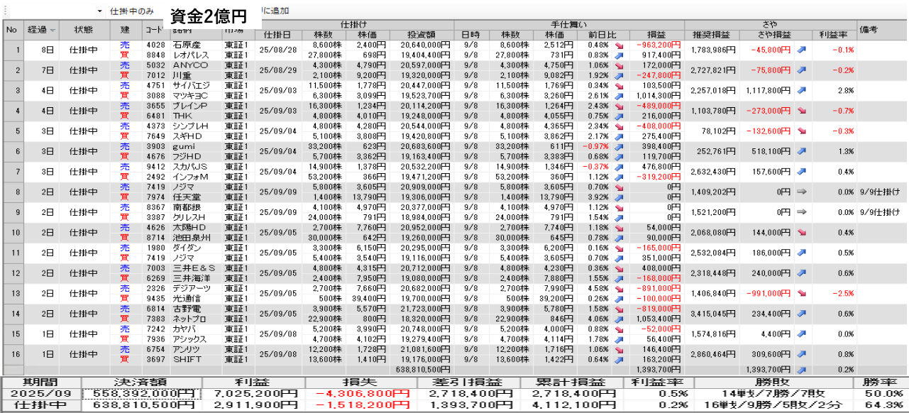 仕掛け及び手仕舞いは、全て翌日の寄付き成行で