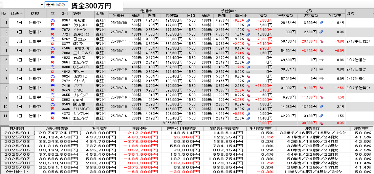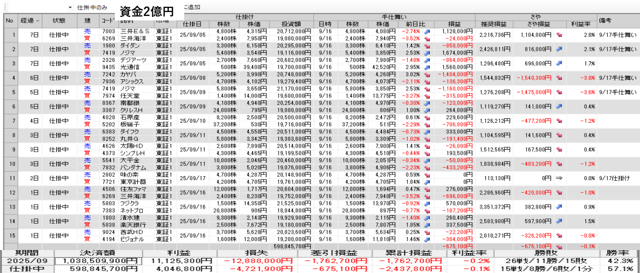仕掛け及び手仕舞いは、全て翌日の寄付き成行で