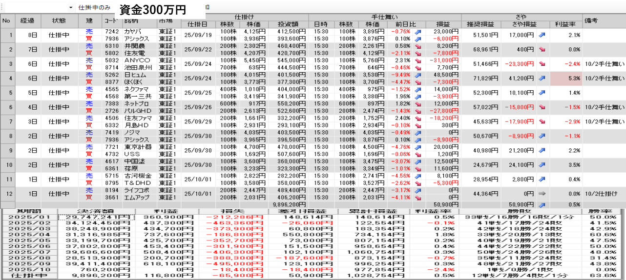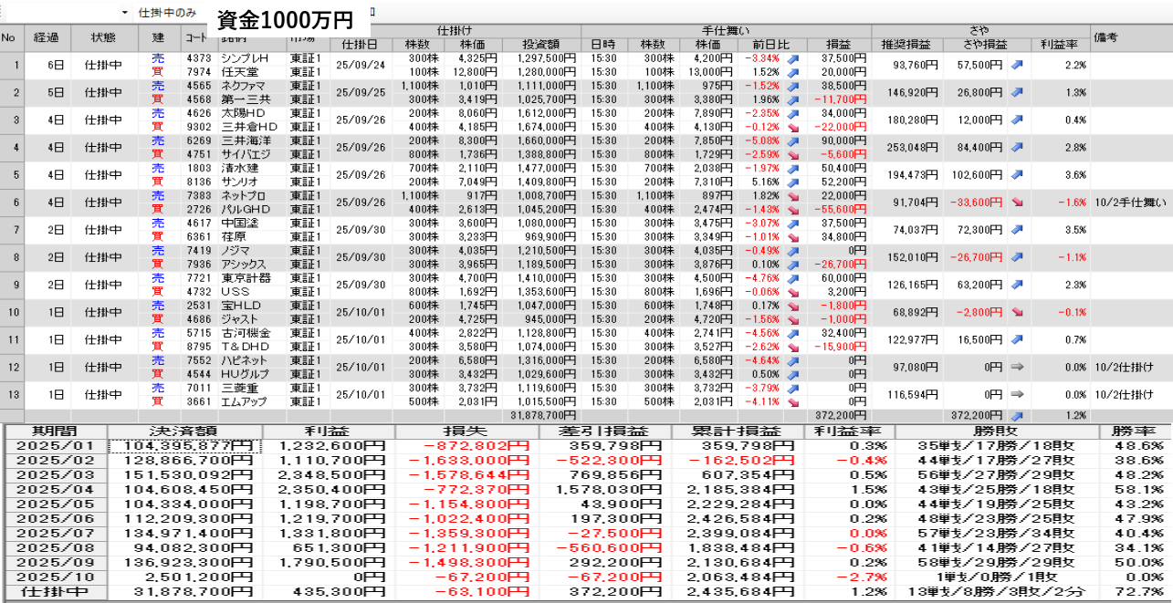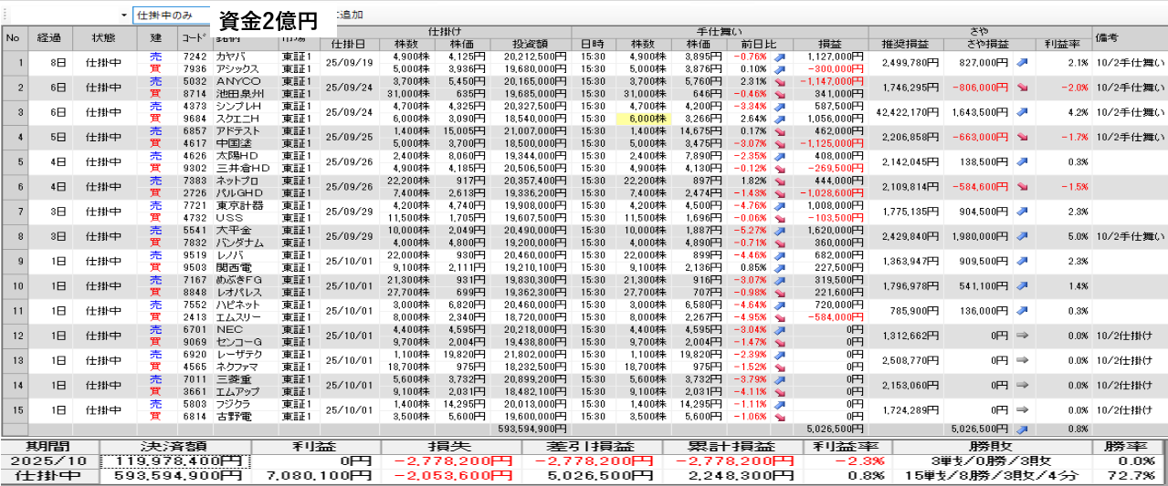 仕掛け及び手仕舞いは、全て翌日の寄付き成行で