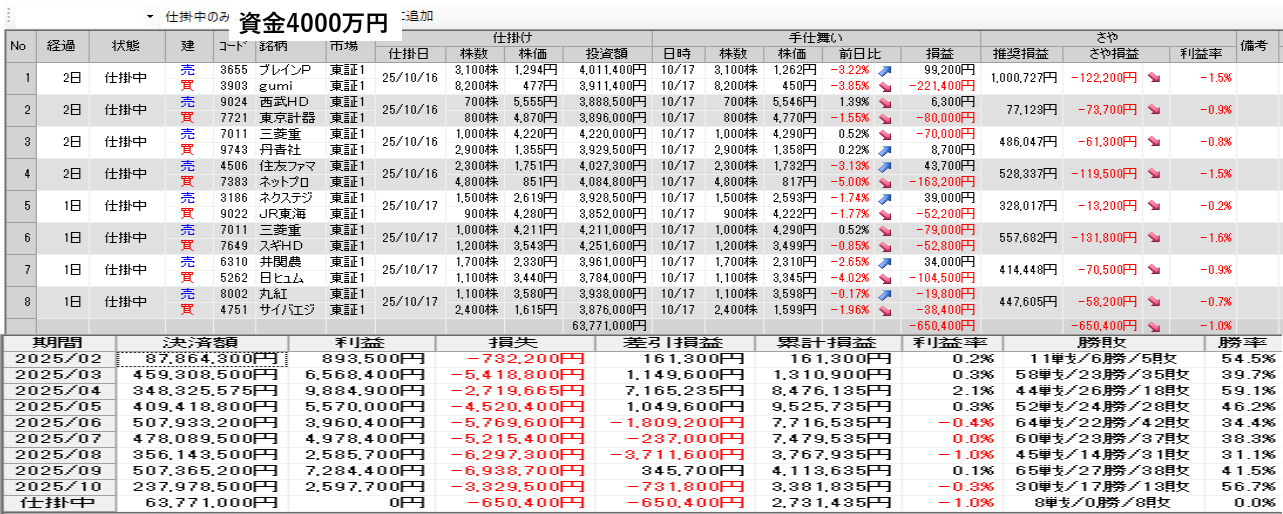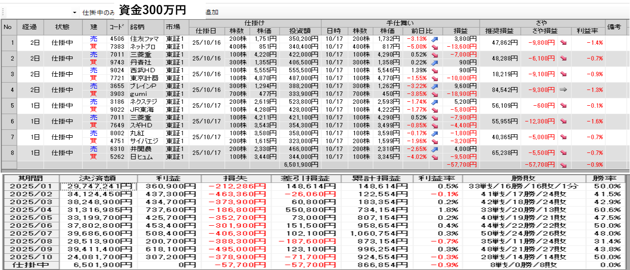 仕掛け及び手仕舞いは、全て翌日の寄付き成行で