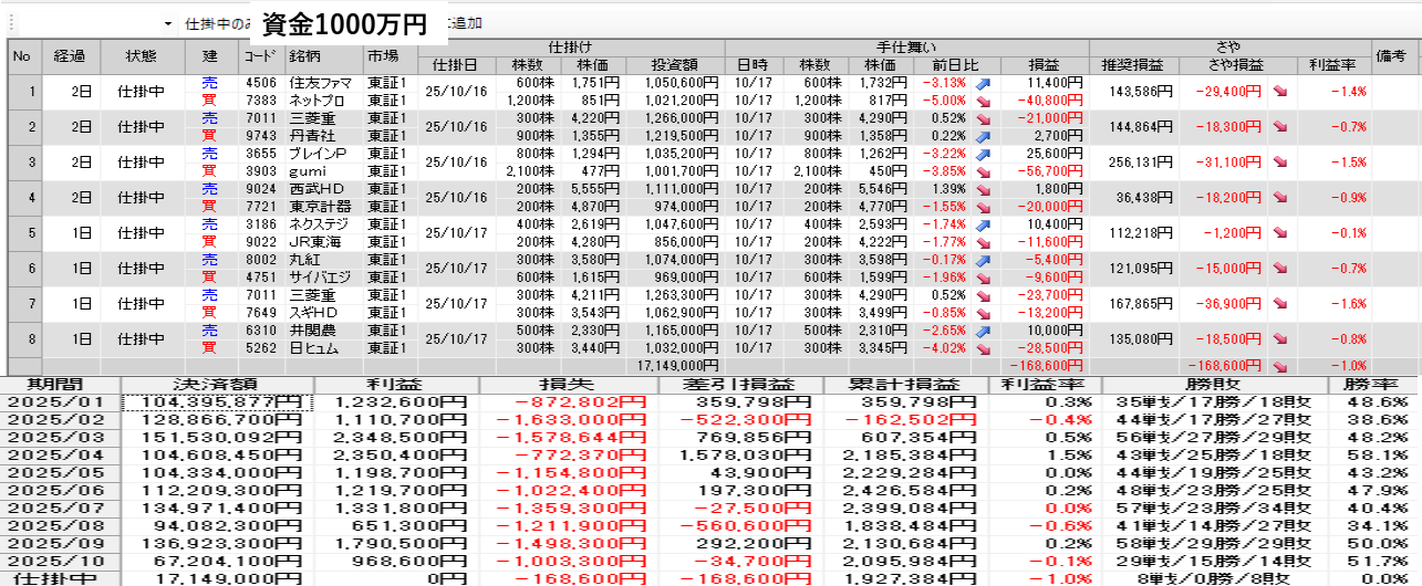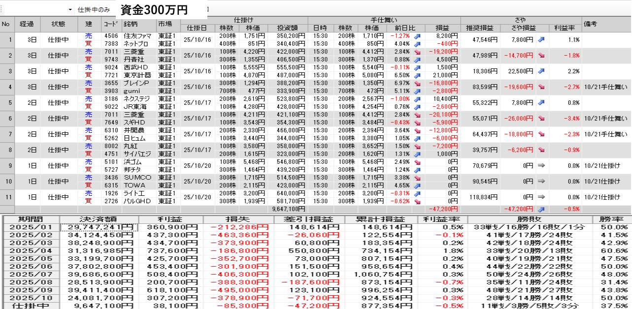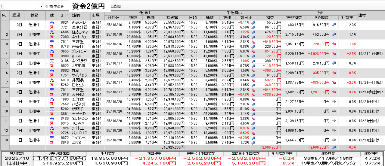仕掛け及び手仕舞いは、全て翌日の寄付き成行で
