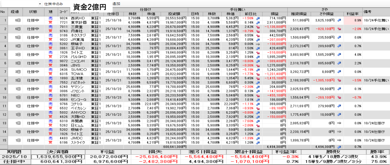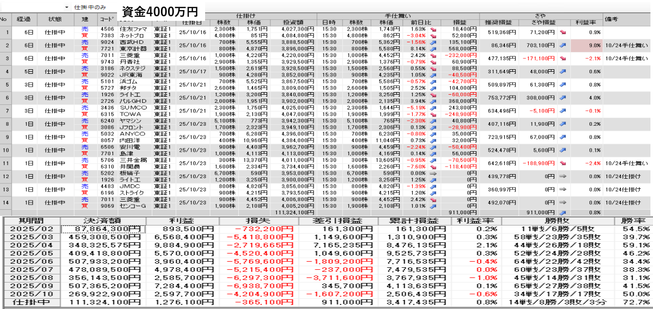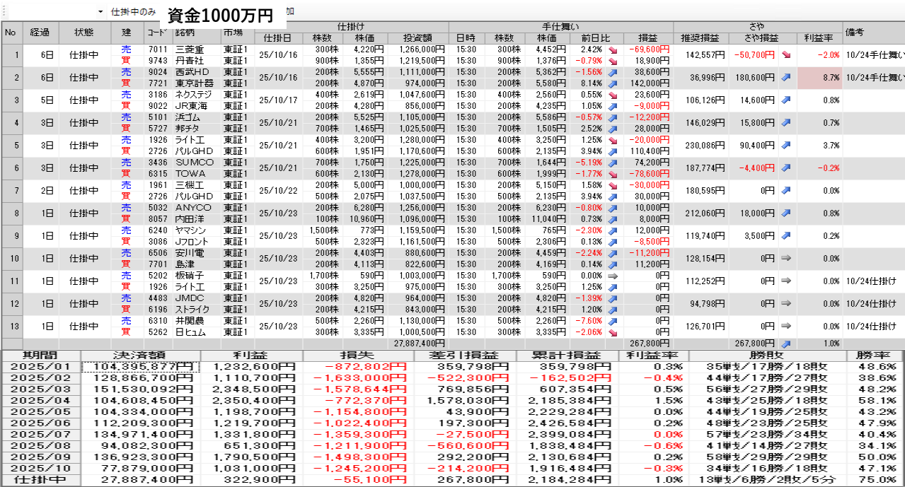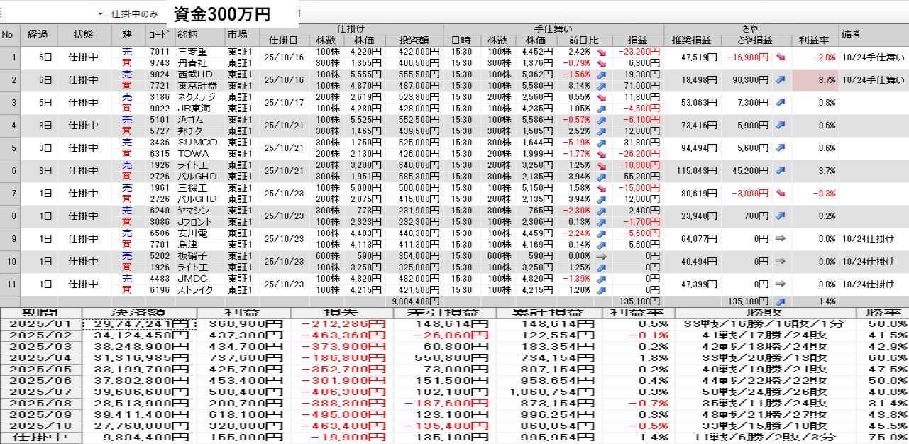 仕掛け及び手仕舞いは、全て翌日の寄付き成行で