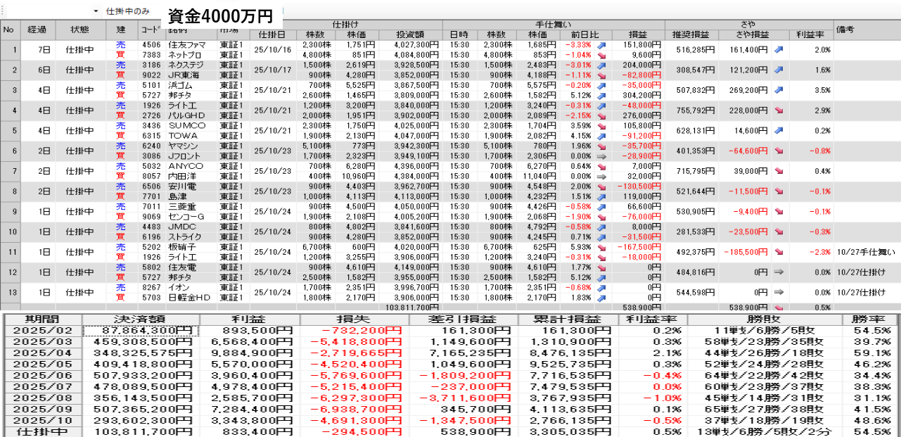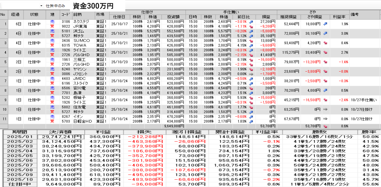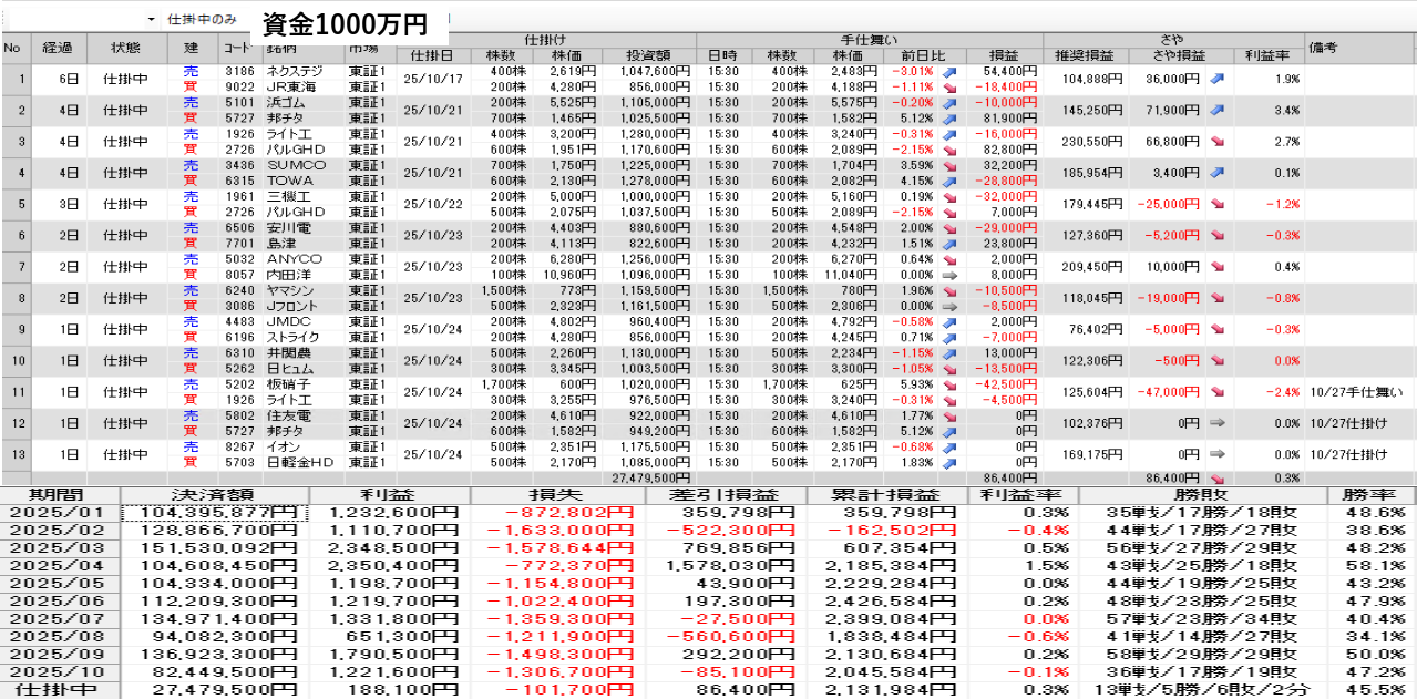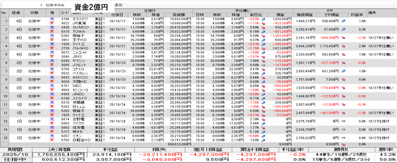 仕掛け及び手仕舞いは、全て翌日の寄付き成行で