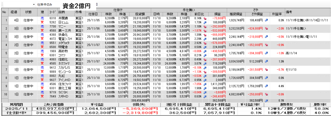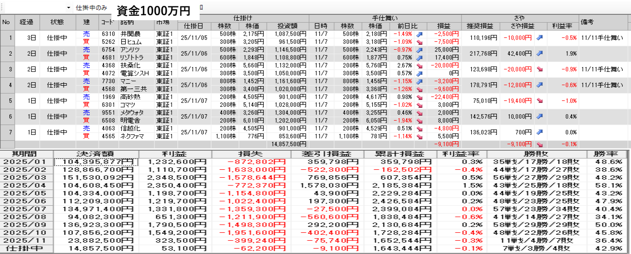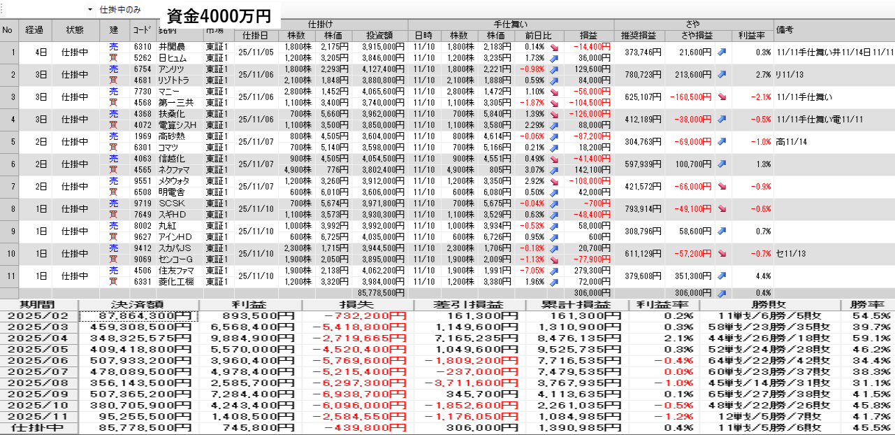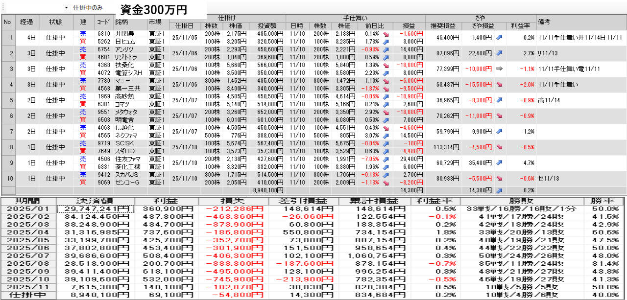 仕掛け及び手仕舞いは、全て翌日の寄付き成行で