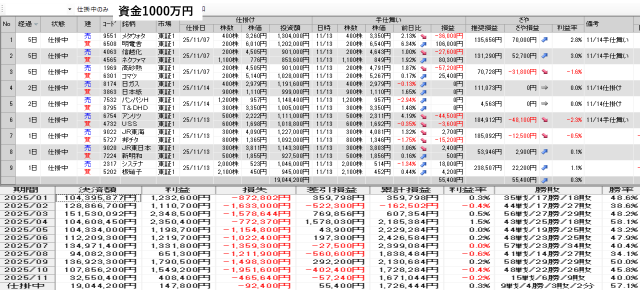 仕掛け及び手仕舞いは、全て翌日の寄付き成行で