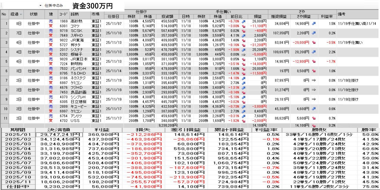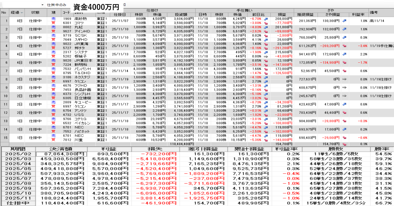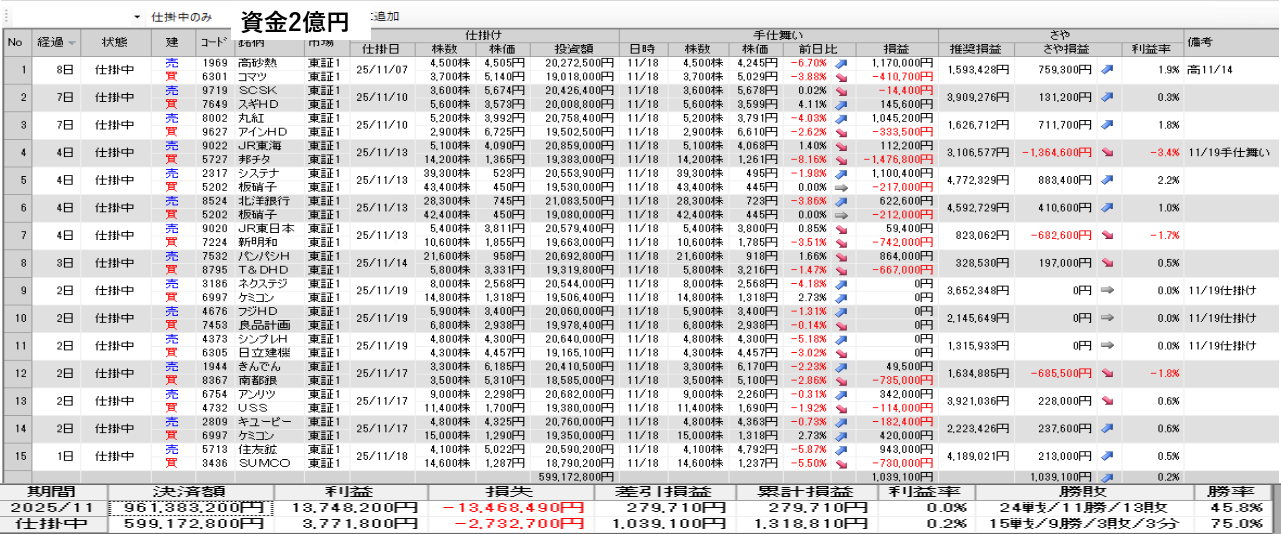 仕掛け及び手仕舞いは、全て翌日の寄付き成行で