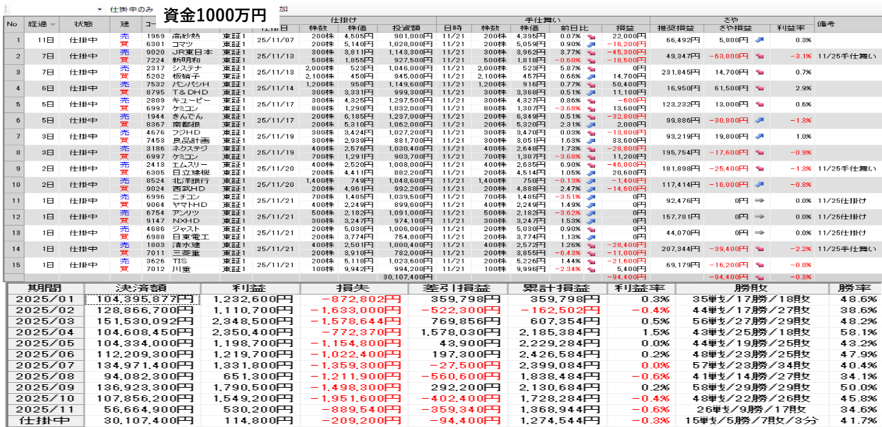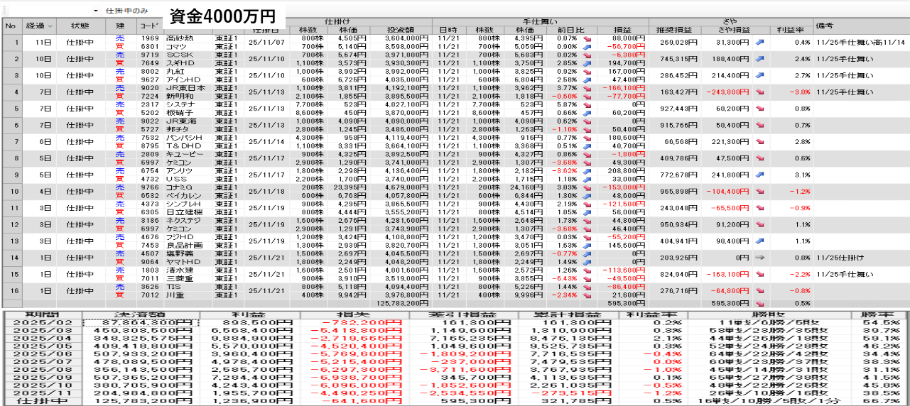 仕掛け及び手仕舞いは、全て翌日の寄付き成行で