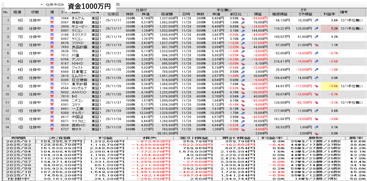 仕掛け及び手仕舞いは、全て翌日の寄付き成行で