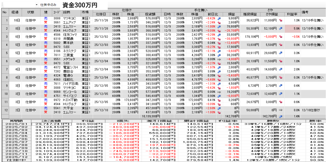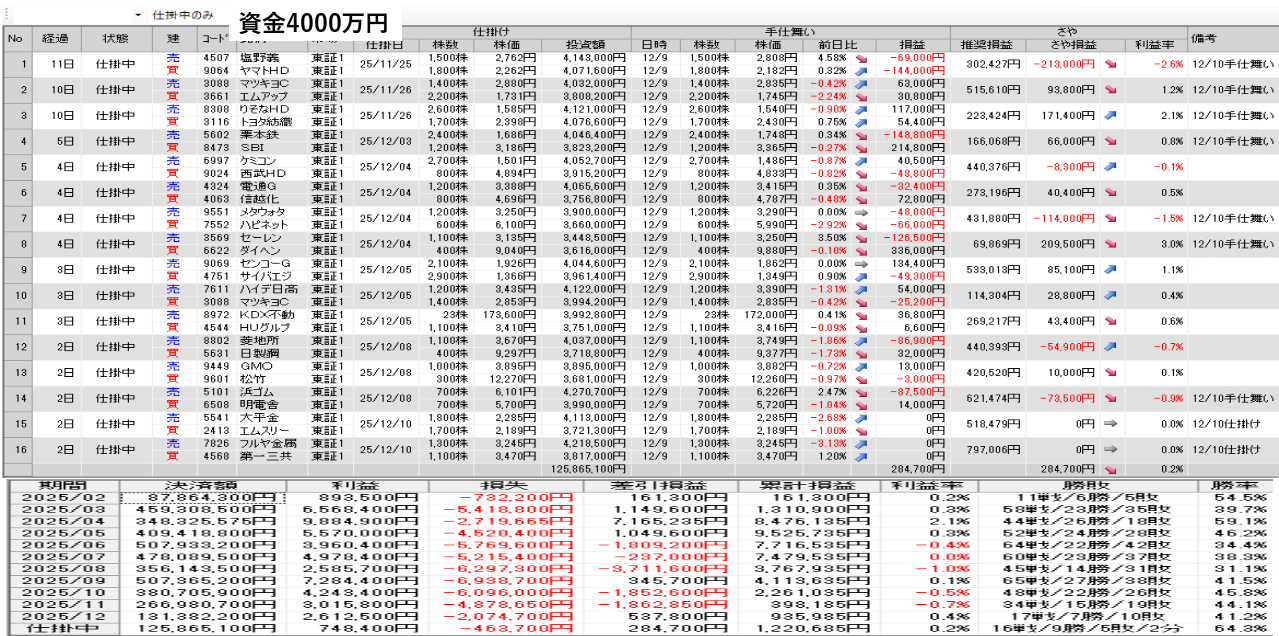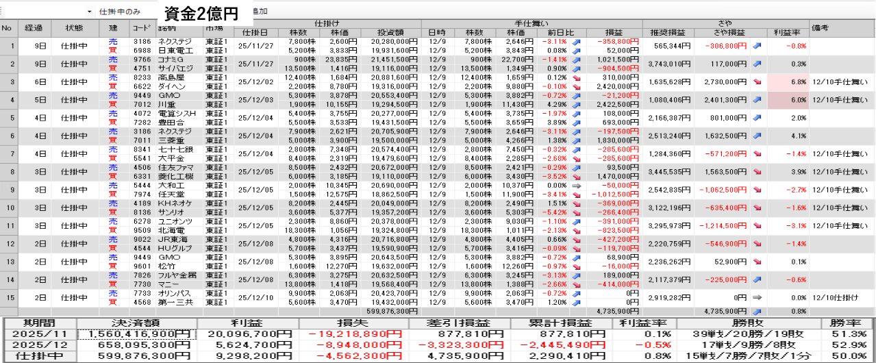 仕掛け及び手仕舞いは、全て翌日の寄付き成行で