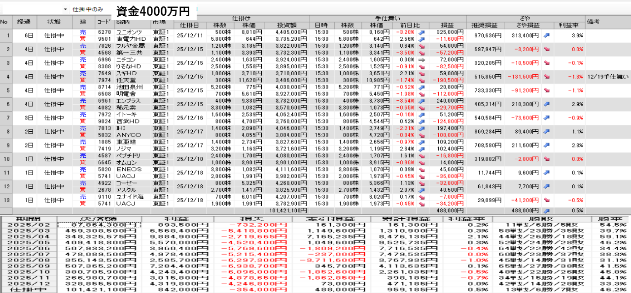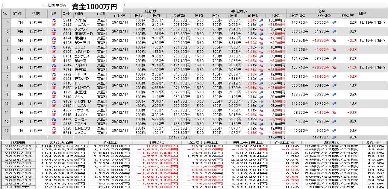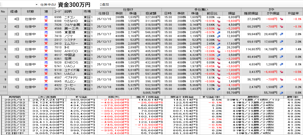仕掛け及び手仕舞いは、全て翌日の寄付き成行で