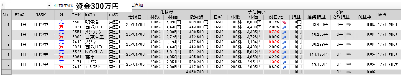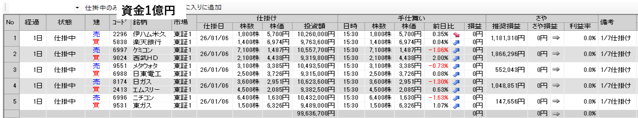 仕掛け及び手仕舞いは、全て翌日の寄付き成行で