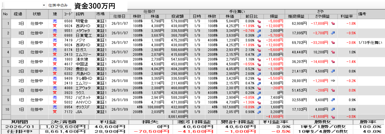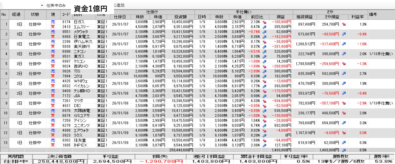 仕掛け及び手仕舞いは、全て翌日の寄付き成行で