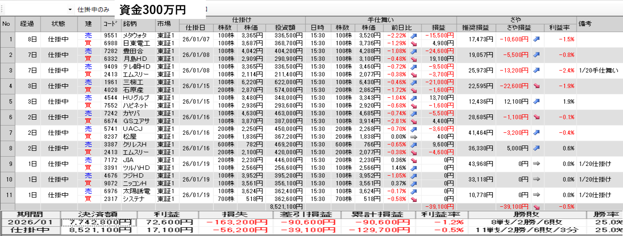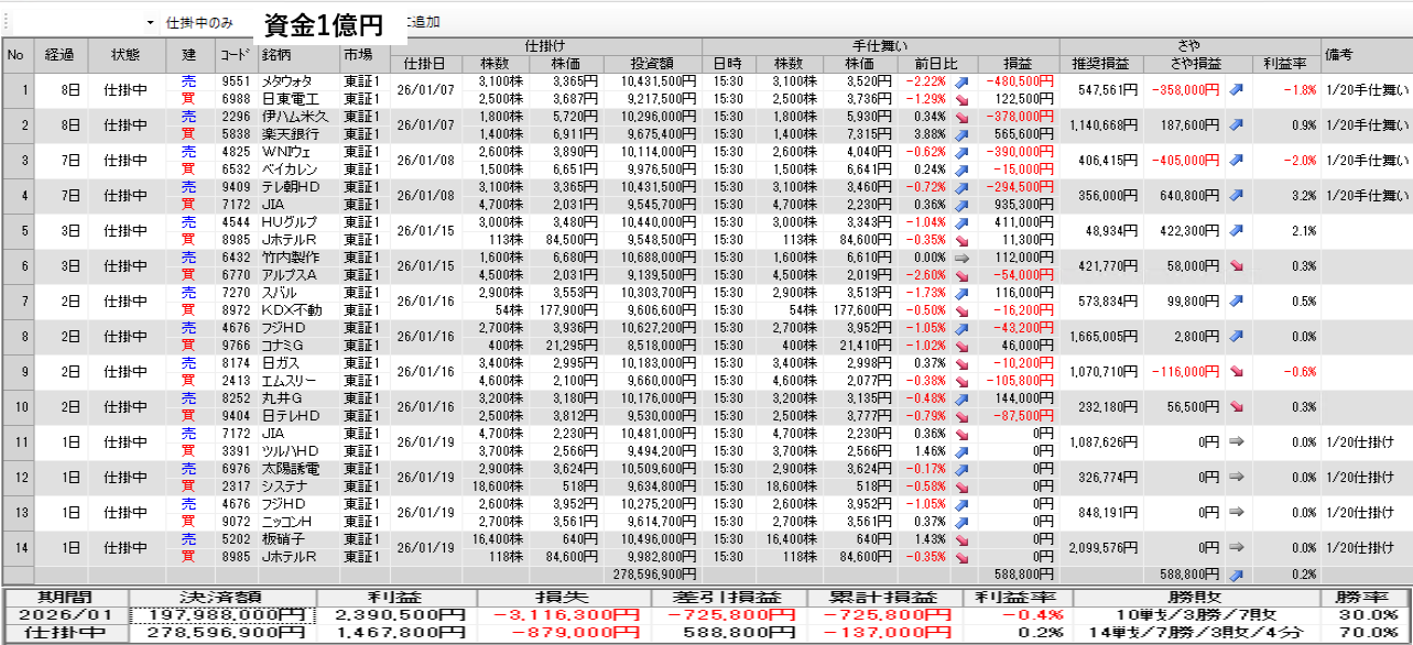 仕掛け及び手仕舞いは、全て翌日の寄付き成行で