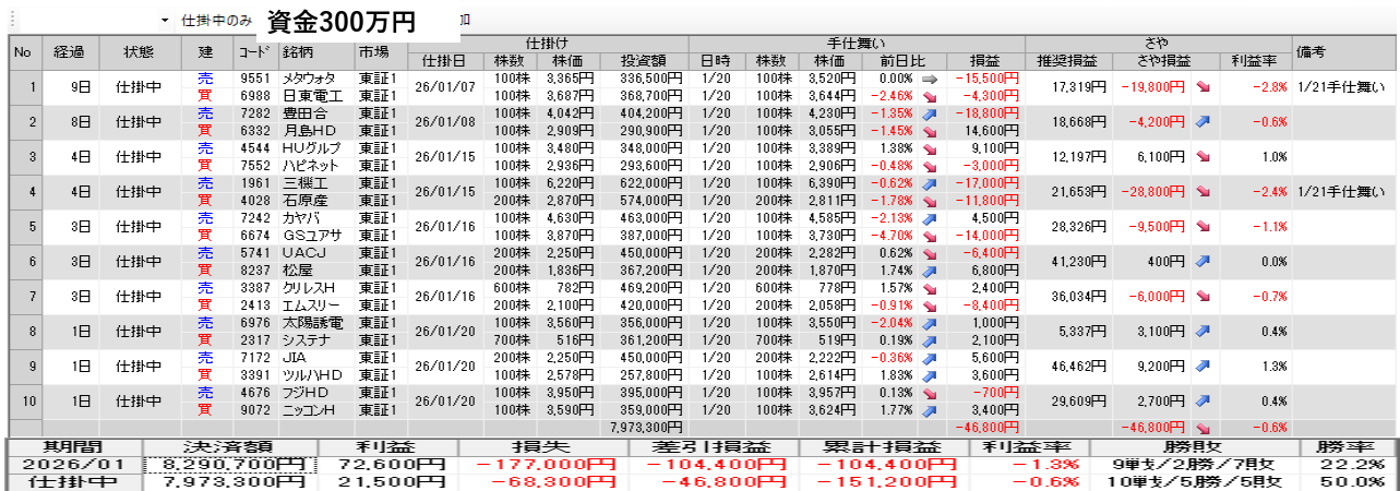 仕掛け及び手仕舞いは、全て翌日の寄付き成行で