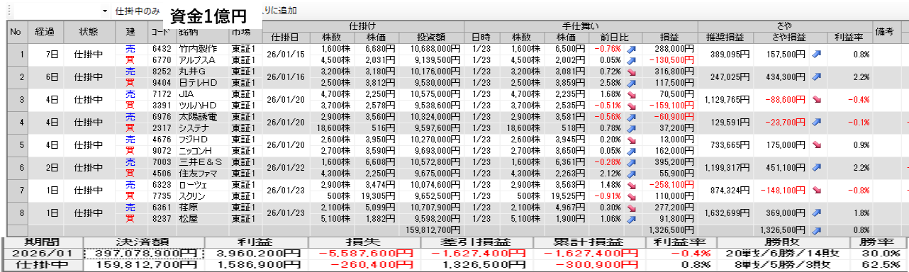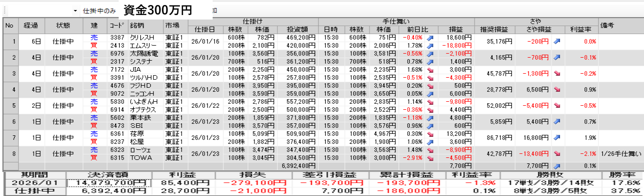仕掛け及び手仕舞いは、全て翌日の寄付き成行で