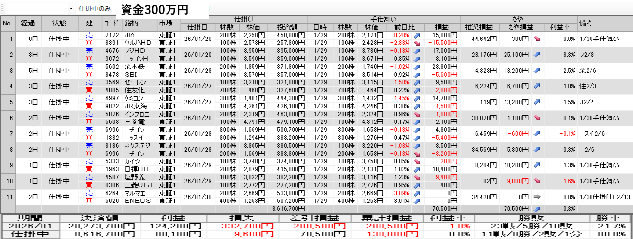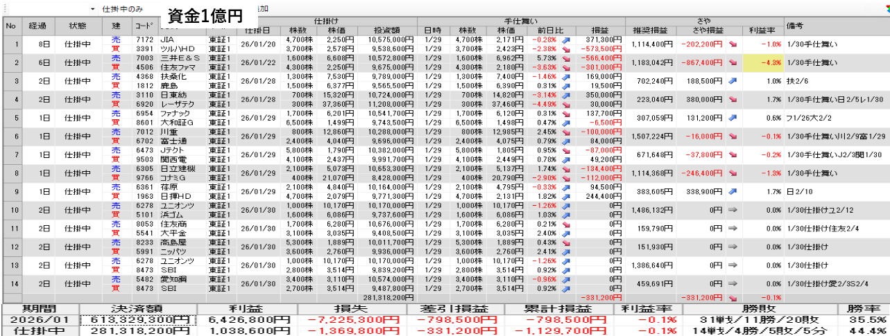 仕掛け及び手仕舞いは、全て翌日の寄付き成行で