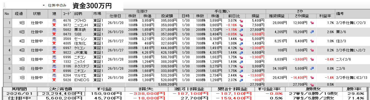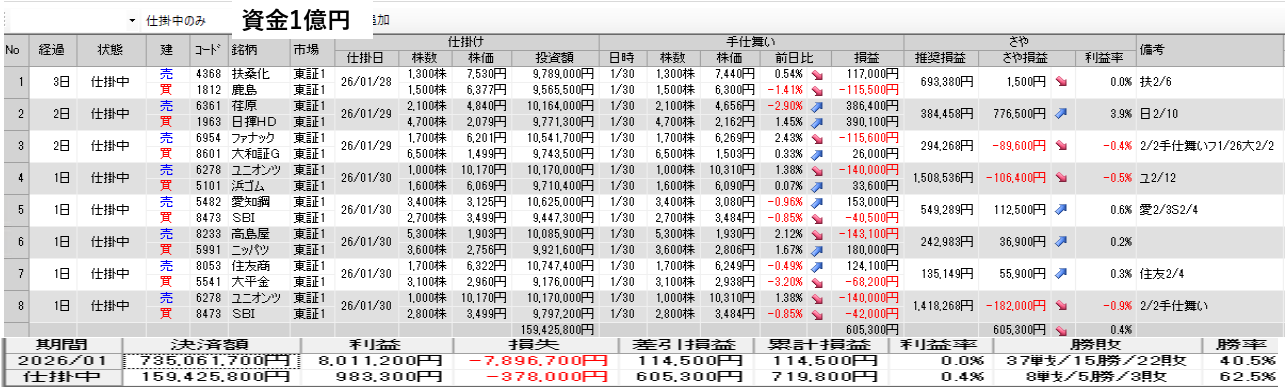 仕掛け及び手仕舞いは、全て翌日の寄付き成行で