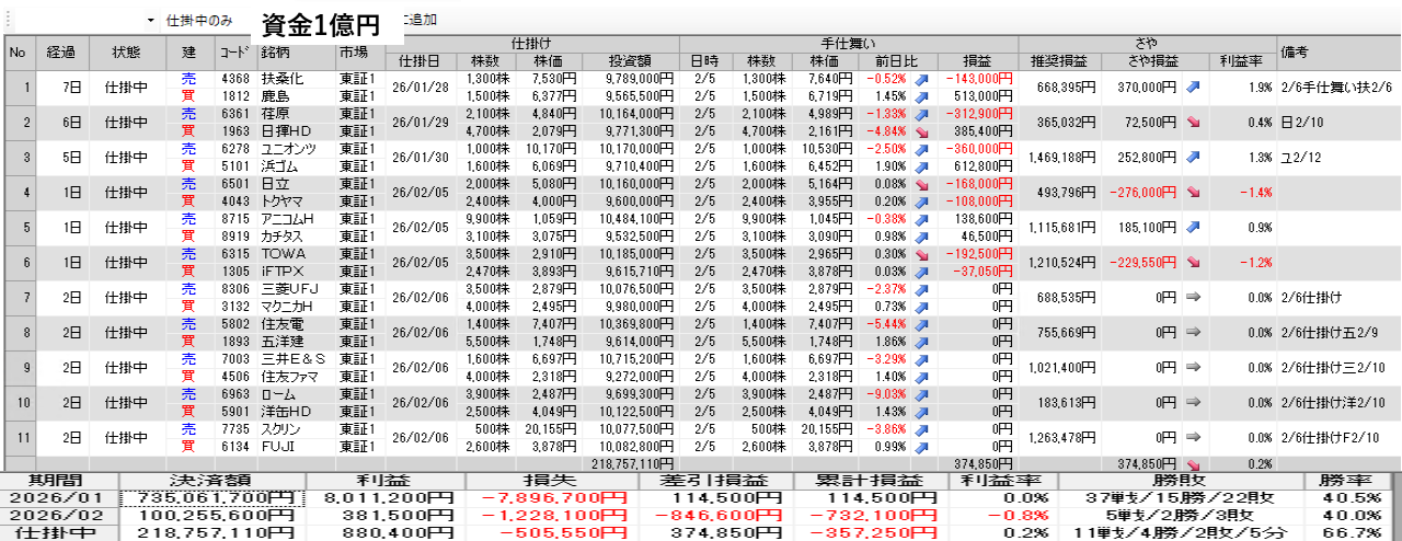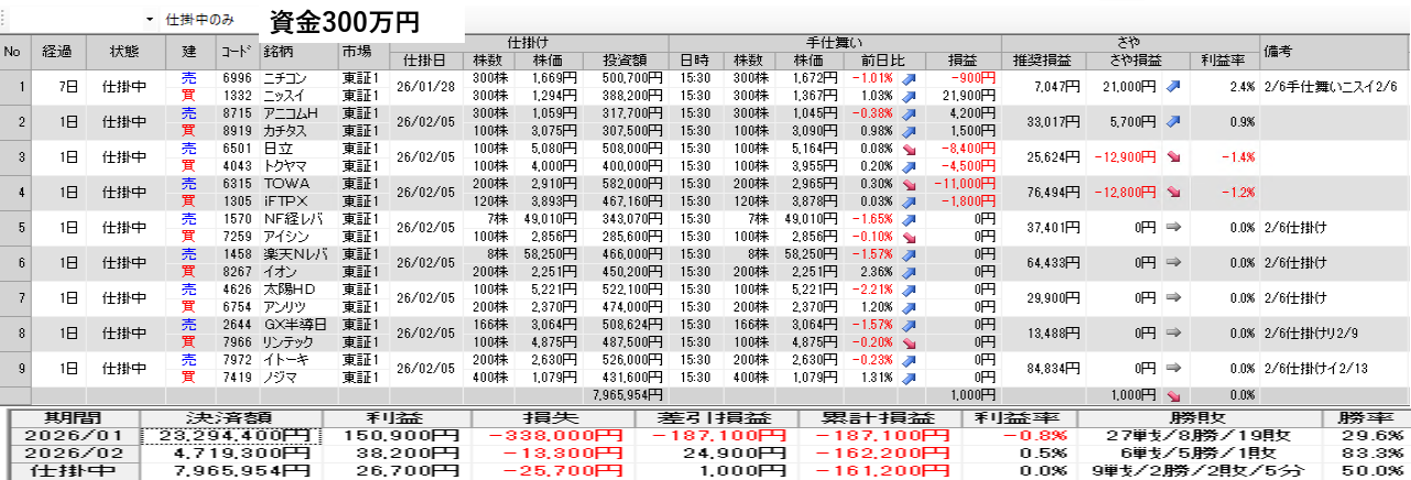 仕掛け及び手仕舞いは、全て翌日の寄付き成行で
