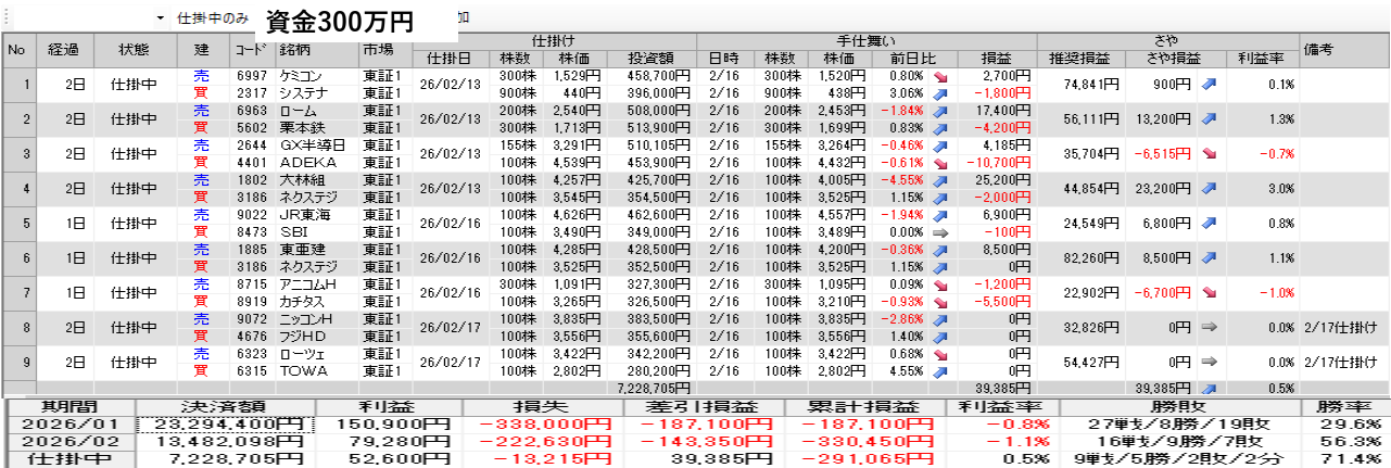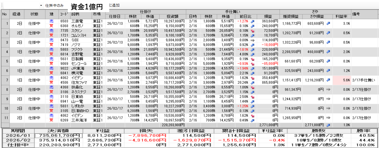 仕掛け及び手仕舞いは、全て翌日の寄付き成行で