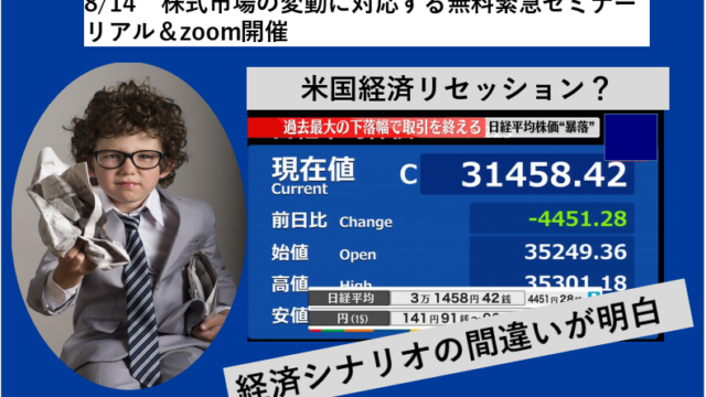 オンライン&オフラインセミナー・相談会 8/14 株式市場の変動に対応する無料緊急セミナーのご案内 2024-08-10 masaike 1日30分の分析で年利30%超のトレーダー育成プログラムが学べるオンライン・スクール