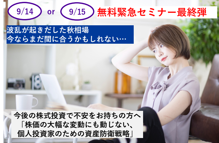 9/14 9/15 無料緊急セミナー最終弾 「株価の大幅な変動にも動じない、 個人投資家のための資産防衛戦略」
